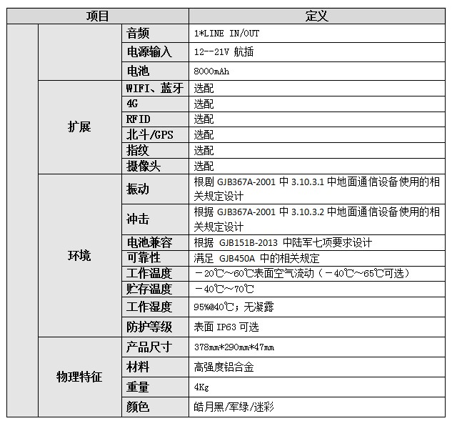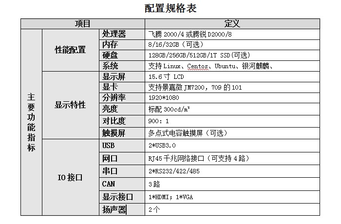 便攜式加固型計算機,處理器飛騰2000/4或騰銳D2000/8,內(nèi)存8/16/32GB(可選),硬盤128GB/256GB/512GB/1T SSD(可選),系統(tǒng)支持Linux、Centos、Ubuntu、銀河麒麟。顯示屏15.6寸 LCD,顯卡支持景嘉微JM7200,709的101,分辨率1920*1080,亮度標(biāo)配300cd/m2,對比度900:1,觸摸屏多點式電容觸摸屏(可選)。