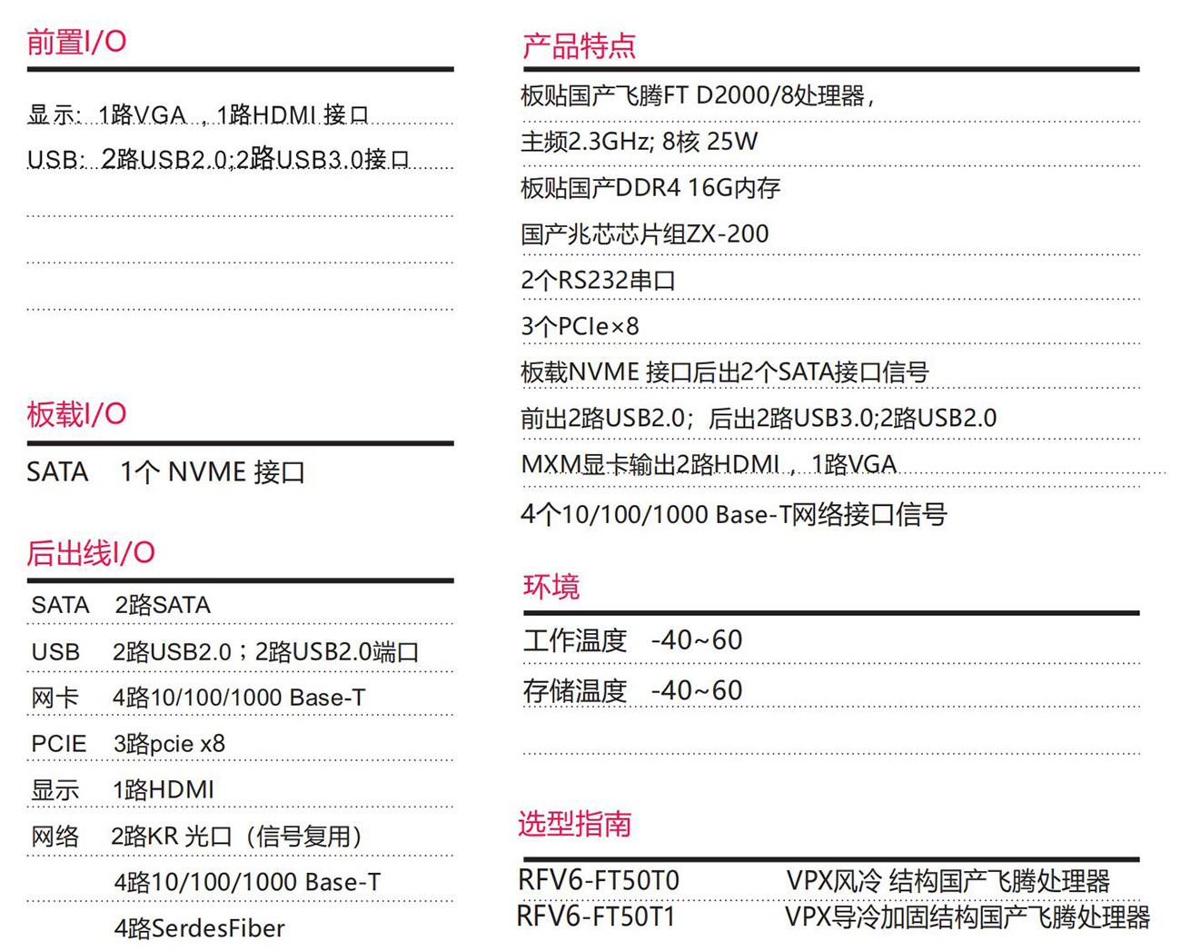 采用國產飛騰處理器FTD2000/8+ZX-200芯片組按國產設計,6U VPX規格。具備豐富的外圍接口;設計了高效 的散熱系統,可顯著提高處理器的浮點運算性能,以太網、PCIe、支持高帶寬數據傳輸,滿足視頻采集與處理、 雷達和聲吶等應用對高速數據傳輸的要求。專為惡劣環境 使用而設計,滿足無人機、裝甲車、水面艦艇等軍工領 域。